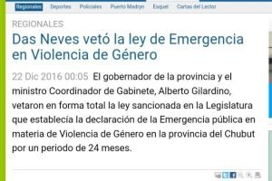 La iniciativa fue presentada por las diputadas Estela Hernández y Gabriela Dufour (PJ-FPV) que insistieron en tratar Sobre Tablas el mismo proyecto del año pasado, que fuera vetado por el Poder Ejecutivo. La Legislatura sancionó la Ley declarando la “Emergencia Pública en Materia de Violencia de Género en el ámbito de la Provincia del Chubut”, por el término de 24 meses y renovándose dicho lapso mediante otra normativa legal.