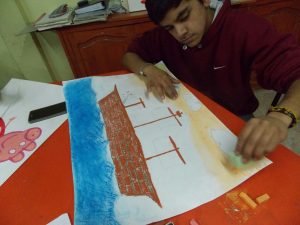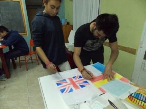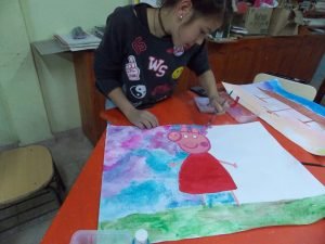 Ludmila (Instructora del Taller de Artes plásticas): Es super didáctico y dinámico. Se van componiendo las imágenes. Cuando uno les dice: “a vos te toca esta parte de la historia, este tema”, lo vas guiando a que razone qué es lo que tiene que poner ahí…y porqué tiene que poner eso… Además se van viendo distintas técnicas, distintas cosas para llegar a esa imagen y después cuando esté todo ya unido, ahí se van a fijar más los contenidos todavía, porque ya va a estar la historia, va a estar la parte del guion unida con las imágenes que es el objetivo final del Kamishibai: contar una historia. Además ellos al ir haciéndolo les queda más todavía…dicen: “Ah mirá, esto era por esto…”.
