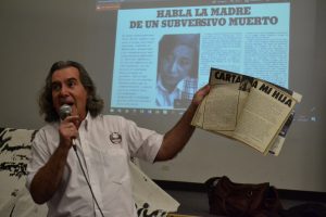 Prensa en dictadura. Llonto mostrando una revista El Gráfico del 78. Allí había una carta trucha del capitán holandés a su hija:»Los fusiles disparan flores», inventó el periodista Enrique Romero, luego corresponsal en España de la publicación que ahora sale en forma mensual. «Piensen que en esa época se vendían hasta 500 mil revistas. Salvo excepciones como radio Colonia y el semanario Nueva Presencia, el resto recién publicó su primera nota de la Esma en 1983 y hubo 600 centros clandestinos de detención», contó en un largo mano a mano con el público que acudió a la cita en la Universidad San Juan Bosco. Una joven mencionó a varias publicaciones, entre ellas Cítirica, Anfibia, Cosecha Roja, Antena Negra TV y FM Alas como medios alternativos que investigan en el territorio la desaparición forzada de Santiago Maldonado.