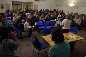 ¿Describiendo el espacio en donde sobresalen dos imágenes enormes, hechas banderas, sobre la izquierda y en el medio? ¿Tratar de aproximadamente contar cuánta gente participó de la charla? -Un joven durante el debate, arrima una anécdota:»Nos vimos en Bariloche este año. Eramos ocho, contándonos a nosotros dos. Hoy somos mucho más»-