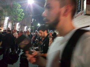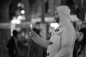 La plaza en Puerto Madryn. Un pastor, un parlante. Un señor hablando solo, después abrazado a dos perros. Dos chicas que se besan. Una bandera con su cara. Tres cartulinas: como en cada una de ellas caben los nombres de Macri, Bulrich y Nocetti. Una vela, dos velas, tres velas. Un mensaje. Una convocatoria. Y nos dieron las diez y las once. Entre las diez y las once, dos vueltas alrededor de la plaza. Chamy.Mitre derecho. Antes una ronda en la esquina en donde se ve un pasacalle que pide por otro desaparecido. El marinero de El Rejunte. Palmas. «Yo sabía…» Santiago, presente. Luciano, presente. Maxi y Darío, presente. Iván, presente. Julián, presente. Miguel, presente. Ahora y siempre. Tribunales. Una vela, dos, más de veinte. Y esa cara. Hecha xilografía, bandera, carteles. Y la pregunta que interpela, desde su barba. ¿Y ustedes, dónde están? Eso. Nosotros, ¿En dónde estamos?