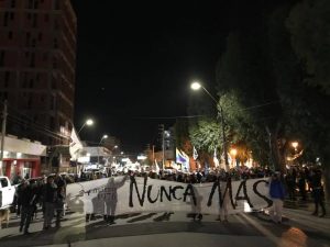 >Nunca Más. El decreto de Macri para que las fuerzas armadas intervengan en las calles motivó que el pueblo salga a las calles. Madryn no fue la excepción. Como tampoco para visibilizar el retroceso de políticas como la ley de medios, las tarifas de gas y de luz, la educación y las consecuencias de represión y falta de aumento en los sueldos durante varios meses, como así las condiciones de los edificios escolares.