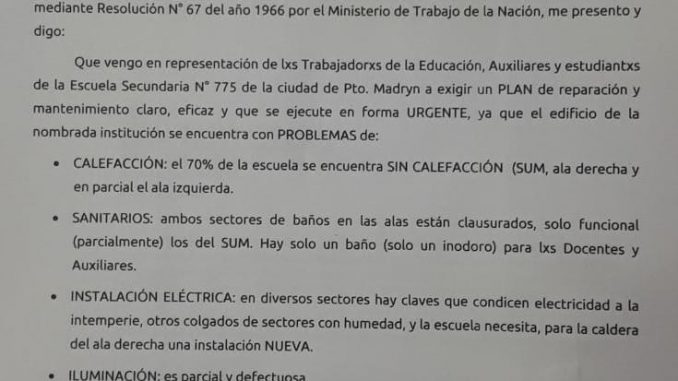 Puerto Madryn es una de las ciudades más afectadas por la desidia de educación de la provincia: hay al menos 11 escuelas con graves problemas edilicios y más de 50 con algún tipo de impedimentos, según el gremio docente Atech. La escuela 775 del barrio Perón es un caso testigo y la problemática, además de la infraestructura, es lo pedagógico, que queda en un segundo plano, pero también lo emocional.