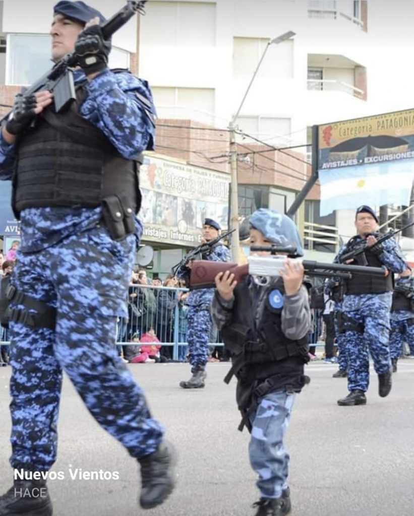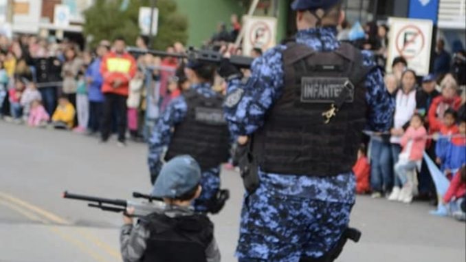 En el desfile oficial que conmemoró el 25 de mayo en Puerto Madryn se registraron imágenes que generaron repudio en parte de la sociedad: un niño vestido como las fuerzas de seguridad (infantería), portando un arma (de juguete). El marco es el debate nacional que generó el rol de la policía en casos de gatillo fácil registrados en la provincia de Buenos Aires, con cinco muertes en una semana.