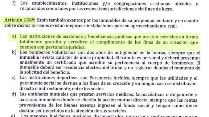 Documento. Resaltado -en amarillo- se observan las referencias que tienen que ver con las exenciones impositivas.Escuela y medios. La escuela 1737 de gestión social que se encuentra en la fundación Ceferino Namuncurá es gratuita para quienes concurren a la misma: 3 comidas diarias y actividades en el aula, talleres y cursos dan forma a una currícula que se extiende entre las 9 y las 19 de lunes a viernes. Por otra parte los medios de comunicación que responden a la entidad como la FM 88.9 y el canal de televisión en youtube no percibe pauta publicitaria: les estudiantes realizan cotidianamente prácticas en comunicación que pueden observarse en las redes sociales como facebook, twitter e instagram. Así y todo, los embates desde el Estado para discontinuar el proceso educativo son constantes e inentendibles.