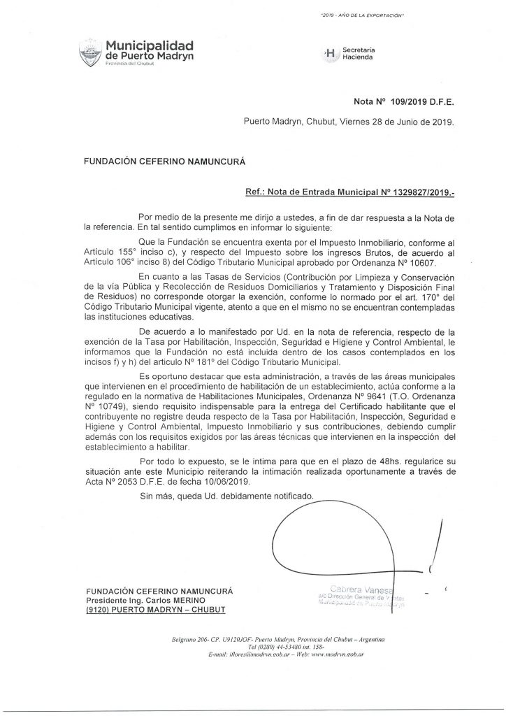 Pese a la presentación de las ordenanzas correspondientes que demuestran la exención para entidades como la Fundación Ceferino Namuncurá se recepcionaron otras demandas como la habilitación municipal y, en los últimos días, el alumbrado, barrido y limpieza de las calles.
