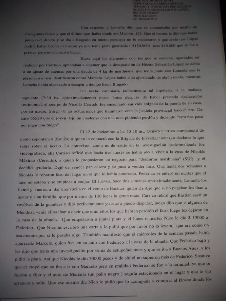 Las conclusiones más salientes son haber considerado que -al menos hasta ahora- Marcelo Campos, alias el mendocino, no fue partícipe de las muertes de Héctor López y de Federico Lomeña. Mientras se perician cruces telefónicos, Campos adquiere otra situación judicial aunque permanecerá en prisión por otra causa. El tribunal también se expidió sobre la situación procesal de quienes habían sido procesados por el juez federal de Rawson, Gustavo Lleral y excarcelados por la Cámara de Apelaciones, tales los casos de Nicolás Wild y Genaro Martínez aunque van a permanecer en libertad.