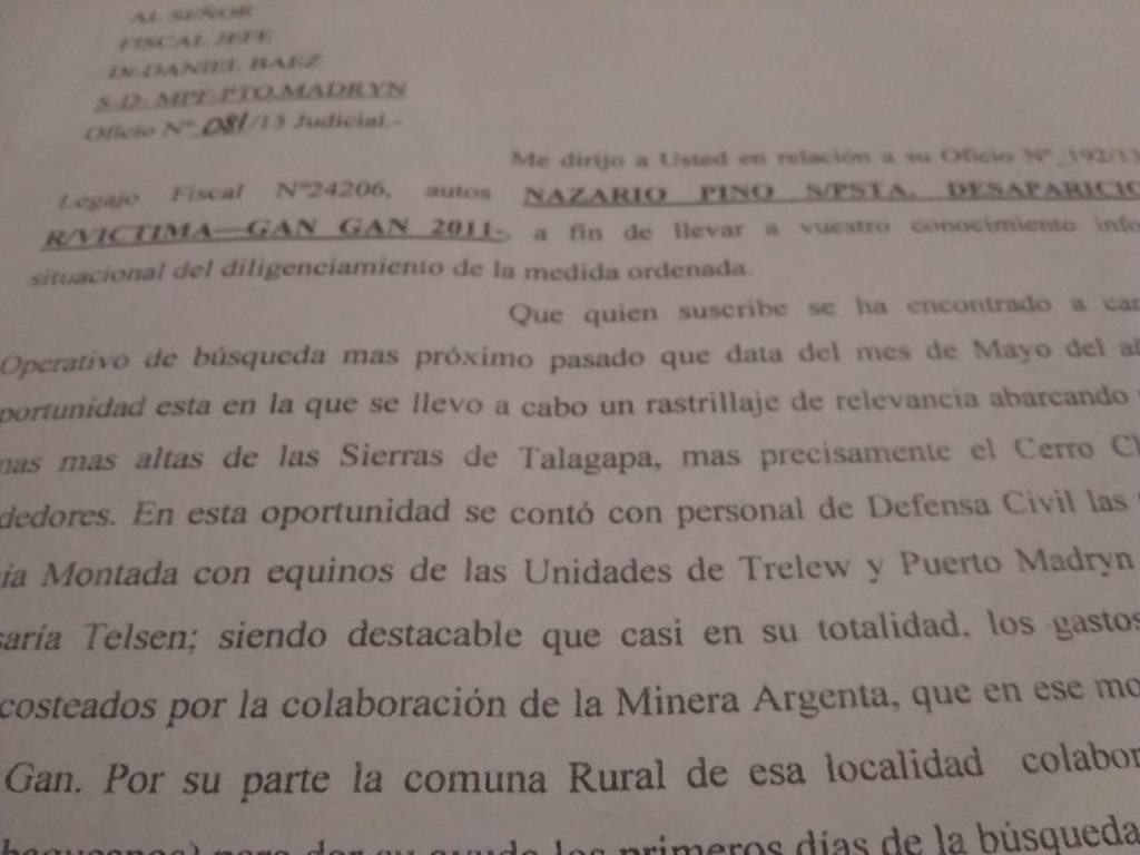 A los reclamos de la familia de la inercia de la fiscalía a cargo de Daniel Baez -por jurisdicción corresponde a Puerto Madryn- se le puede agregar que los gastos de los rastrillajes para dar con el paradero de Pino -ver foto, fascímil del expediente- los abonó la empresa «Minera Argenta», subsidaria de Panamerica, a quien la madre del desaparecido acusó por las malas condiciones en que estaban viviendo producto de la falta de agua.