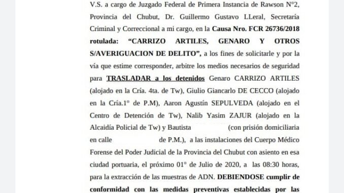La causa que lleva la denominación «Carrizo Artiles, Genaro y otros sobre averiguación de delito Expte. N°FCR 26736/2018» surgió una vez que dio vista la justicia federal al trámite iniciado en el ministerio público fiscal de Puerto Madryn tras las primeras detenciones realizadas por la policía provincial.