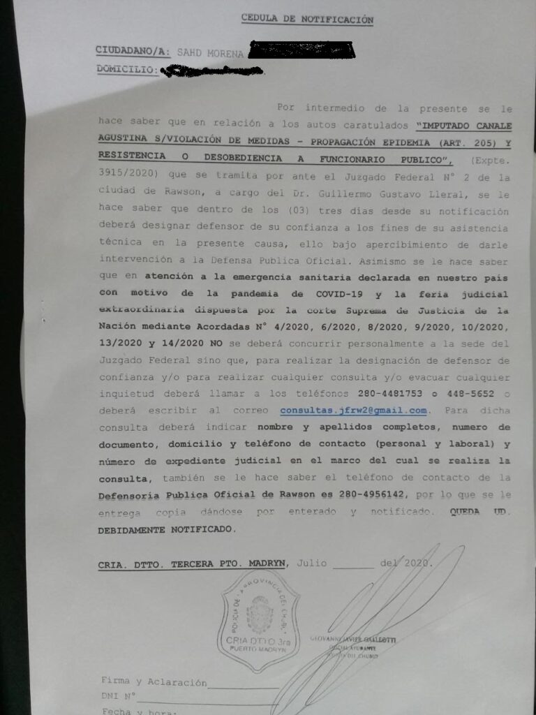 La notificación que recibió ahora es consecuencia de aquella detención arbitraria. Si se lee la copia del documento más abajo, en la cédula que le llegó a la vecina madrynense no figura su nombre en la imputación de la causa, sino otro, lo que sería motivo de nulidad.