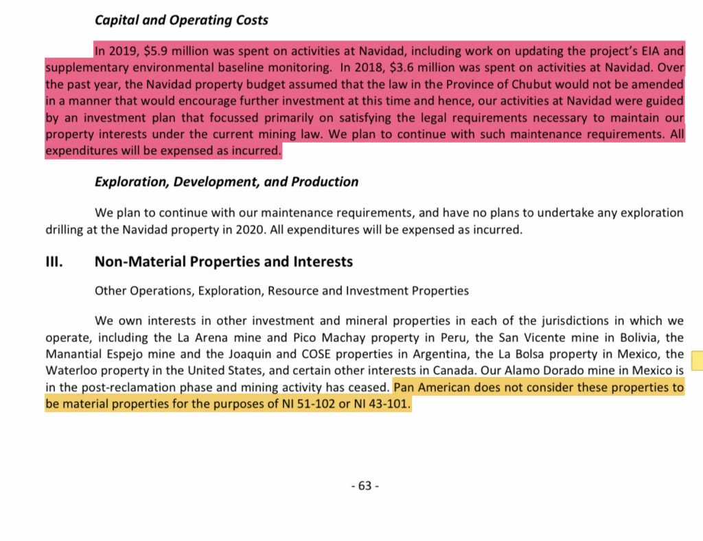 En el balance anual de PAS [ver foto] reconocen haber duplicado la inversión en Chubut respecto a 2018: “en 2019 fueron invertidos u$s 5.9 millones de dólares en actividades en (Proyecto) Navidad”, pero no informan con precisión en qué, más allá de vagas referencias a “tareas de mantenimiento” y “monitoreo ambiental”.