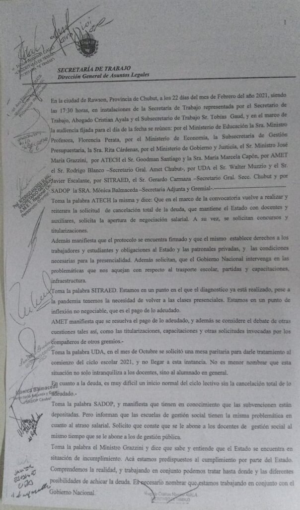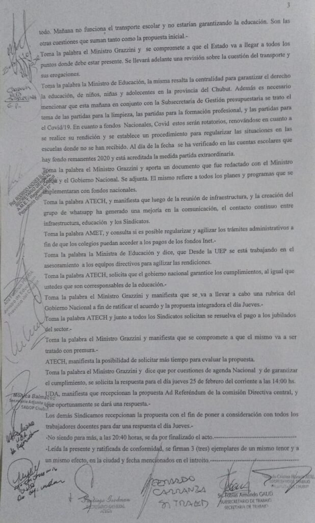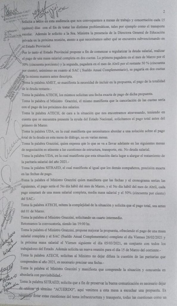 En el acta firmada entre el Ejecutivo y los gremios presentes [VER DOCUMENTO] quedó plasmada la oferta de pago pero también quedaron pendientes temas a resolver como infraestructura, vacunación y situación de jubiladxs. “Por el tema infraestructura va a haber escuelas que no comiencen el ciclo lectivo porque no están en condiciones”, reconoció Marcela Capón, dirigente de ATECH, en entrevista con la radioescuela [ENTREVISTA COMPLETA A CONTINUACIÓN].