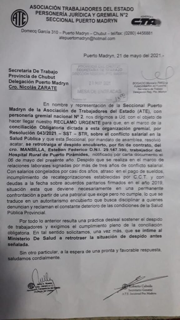 El médico Esteban Federico Mansilla fue desvinculado de su puesto, tras concluir su contrato, en el hospital rural de Puerto Pirámides. Deberá desalojar su vivienda, el próximo 1 de junio. La decisión lleva la firma de Jimena Marcos, subsecretaria de planificación y capacitación. La comunidad recolectó firmas para que mantenga su labor. Los pedidos, también por parte de integrantes de la escuela fueron dirigidos al jefe comunal, Fabián Gandón. El gremio ATE, a través de un escrito, se pronunció que se trata de un despido encubierto. Mansilla, oriundo de provincia de Buenos Aires, reside junto a su familia desde hace 4 años en la villa balnearia. El profesional había realizado una denuncia por abandono de persona luego que una paciente, según afirmó, no recibió el esquema de inyecciones correspondientes a una flebotrombosis.