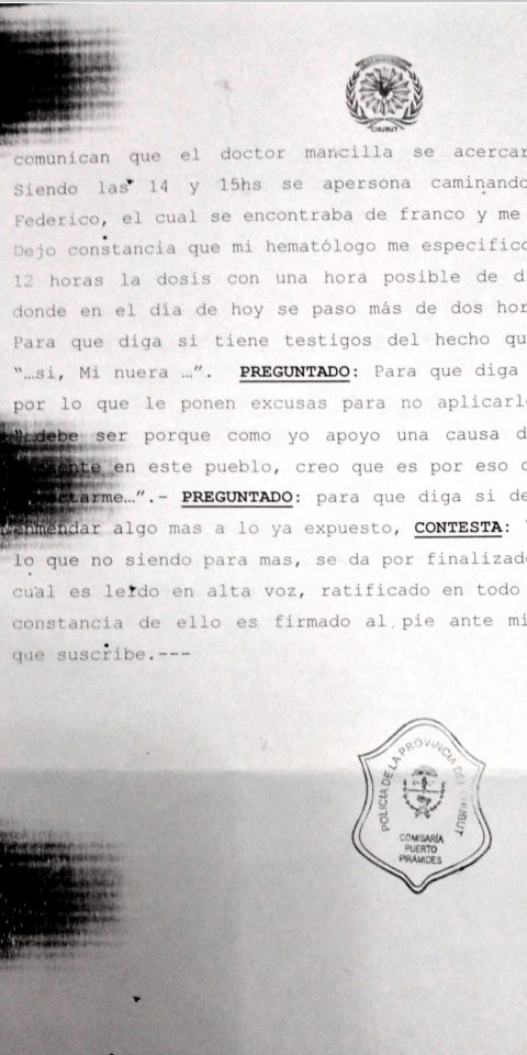 La Namunkurá accedió a la denuncia de Delgado en la cual hace mención a que cree que no le realizaron las inyecciones porque » debe ser que yo apoyo una causa de abuso que está muy presente en este pueblo, creo que es por eso que no quieren venir a inyectarme», relató la mujer ante el interrogatorio policial.